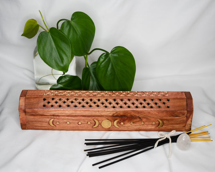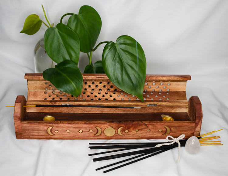 The hand-carved wooden incense casket box not only stores incense but is also a burner for incense cones and sticks.